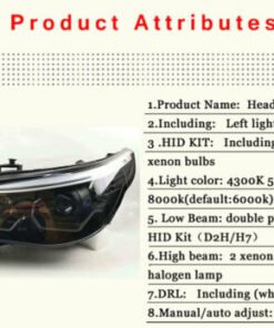 •Installment: 1.Our headlights are suitable for all version which is original headlights are halogen bulbs. If your original headlights are xenon lights, please contact us before you place an order. •Product Details: 1. Product Name: Headlight assembly 2. Including: Left light and Right light 3 . HIK KIT: Including 2 Ballasts and 2 xenon bulbs 4. Light color: 4300K 5000k 6000K 8000k(default:6000k) 5. Low light: HID bifocal projector xenon kit 6. Low beam: 2 xenon lamp(D2H/H7) 7. High beam: 2 xenon lamp + 2 halogen lamp 8. DRL: Including (white) 9. Manual/auto adjust: Support All required harness (For Plug and Play installation)